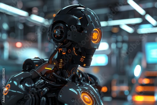 Fototapeta premium Futuristic robot with glowing details standing in a technologically advanced...