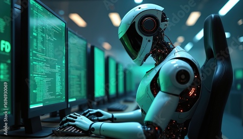 © miss irine, Fototapeta premium Futuristic robot works at multiple computers displaying code. Advanced automation in modern room. Technology, AI, and data processing in cybernetic future. Innovation in digital workflow.