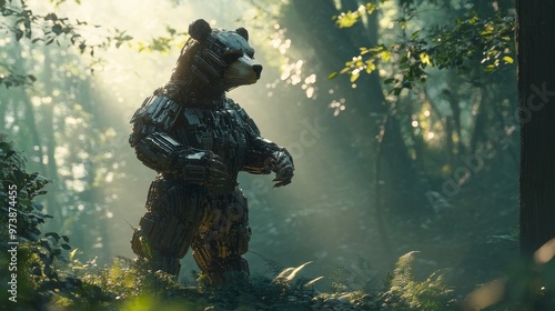 © Thavesak, Fototapeta premium Futuristic Robotic Bear Standing in a Sunlit Forest