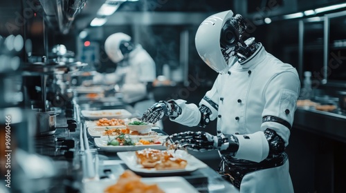 Fototapeta premium Futuristic robotic chefs preparing gourmet meals autonomously: Robots...