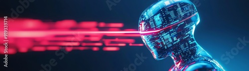 Obraz premium Futuristic robotic figure with glowing eyes and laser technology,...