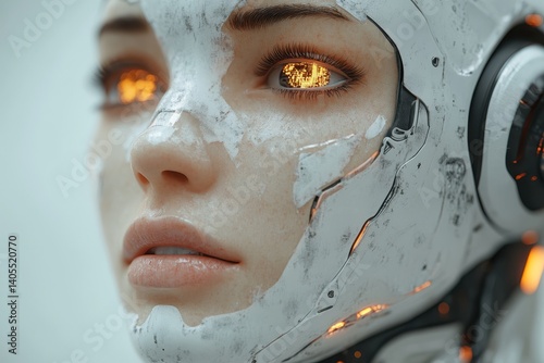 Fototapeta premium Futuristic robotic figure with luminous eyes showcases advanced technology in close-up view
