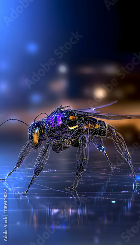Fototapeta premium Futuristic robotic insect on digital surface, city lights background; tech,...