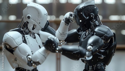 © DruZhi Art, Fototapeta premium Futuristic Robotic Sparring Match, Humanoid Robots Boxing in White and Black Armor