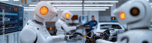 © Manita, Fototapeta premium Futuristic robotics workshop showcasing advanced robots assembling modern technology. A glimpse into the automated future.
