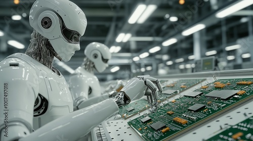 Fototapeta premium Futuristic Robots Assembling Circuit Boards in Factory