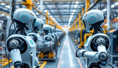 Fototapeta premium Futuristic Robots Collaborating in Modern Smart Factory Assembly Line