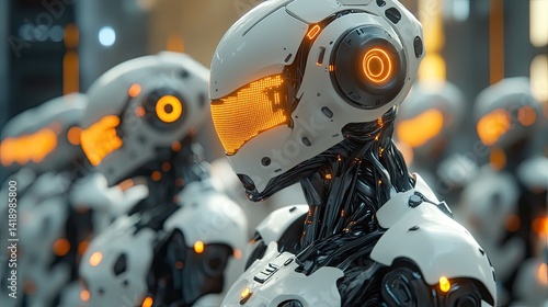 © ShakkBbo9495, Fototapeta premium Futuristic robots in a line, showcasing advanced technology.