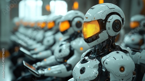 Fototapeta premium Futuristic robots in a row, illuminated faces.