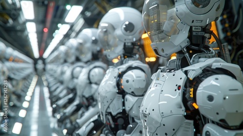 © DJINN 369, Fototapeta premium Futuristic Robots in Modern Industrial Environment Showcasing Advanced Technology and Upscale Automation