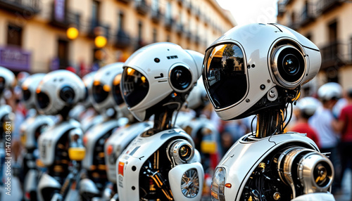 © okaro, Fototapeta premium Futuristic Robots Interacting in a Vibrant Urban Setting