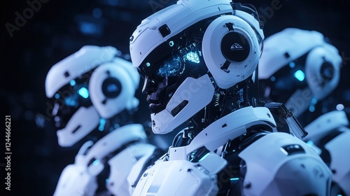 Fototapeta premium Futuristic robots standing in a row with glowing eyes