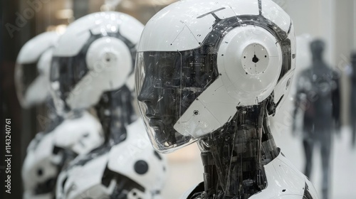 Fototapeta premium Futuristic robots with mechanical designs standing in a sci-fi environment