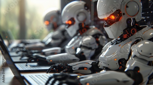 Fototapeta premium Futuristic Robots Working on Laptops in a Modern Office Setting with Advanced...