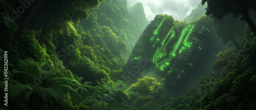 Fototapeta premium Futuristic ruins entwined in lush jungle greenery