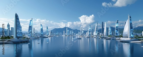 © tanapat, Fototapeta premium Futuristic sailing event in a high-tech marina coastal city digital art marine environment panoramic view innovation