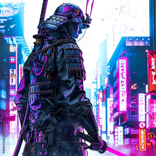 Fototapeta premium Futuristic samurai in neon-lit cityscape, blending traditional armor with...