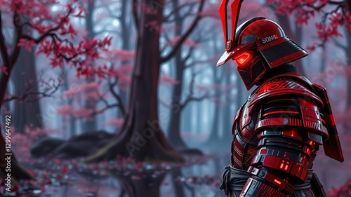 Naklejka premium Futuristic samurai in reflective armor and red accents standing in artificial forest, futuristic, concept art