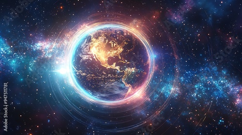 Obraz premium Futuristic Scene of Planets Orbiting Glowing AI Sphere with Cosmic Background and Abstract Light Effects