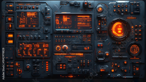© HQAsset, Obraz premium Futuristic Sci-Fi Control Panel with Glowing Orange Lights and Buttons, a Detailed 3D Rendered Interface