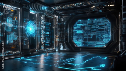 Obraz premium Futuristic Sci-Fi Control Room with High-Tech Interfaces and Neon Lighting, Ideal for Technology, Gaming, and Cyberpunk Themes in a Digital Environment