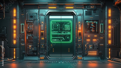 Obraz premium Futuristic Sci-Fi Control Room with Neon Lights and High-Tech Panels in a...