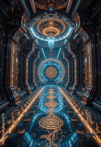 Obraz premium Futuristic Sci Fi Corridor Design Elegant Gold and Blue Illuminated Pathway...
