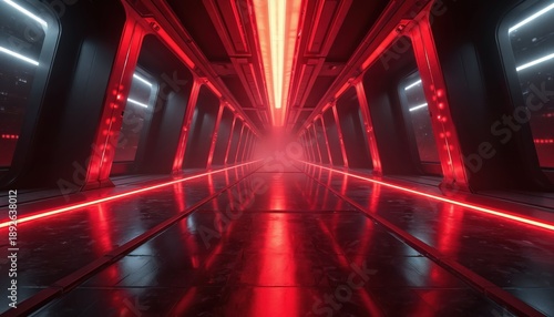 Fototapeta premium Futuristic sci fi corridor with bright red neon lights. Dark tunnel leads...