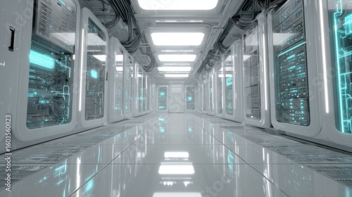 Naklejka premium Futuristic sci-fi corridor with glowing lights and sleek panels in a high-tech environment