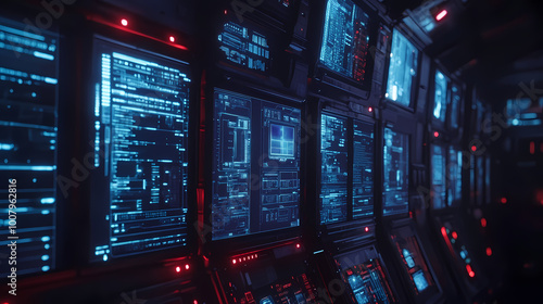 © Thiago, Obraz premium Futuristic sci-fi hallway interior with computer and monitor screen on wall, 3d rendering. Spaceship Interior. Illustration