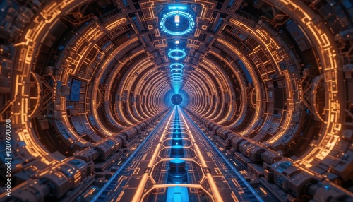 Obraz premium Futuristic Sci Fi Tunnel Corridor with Orange and Blue Neon Lights Digital...