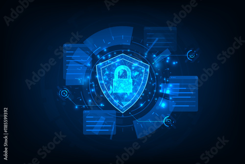 © Mooam, Obraz premium Futuristic security online connection network concept. Cyber security concept. Protect data. Shield on tech circle.