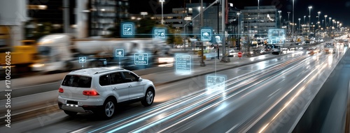 © lililia, Obraz premium Futuristic self-driving car shows cutting-edge technology as it drives on the highway while monitoring surrounding vehicles with precision