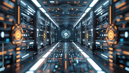 Fototapeta premium Futuristic server room corridor with glowing elements and digital panels