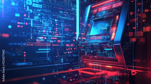 Fototapeta premium Futuristic server room; digital data streams; glowing red and blue;...