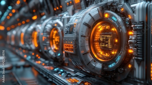 Obraz premium Futuristic Server Room: Glowing Orange Cores