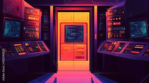 Naklejka premium Futuristic server room interior with glowing displays and controls.