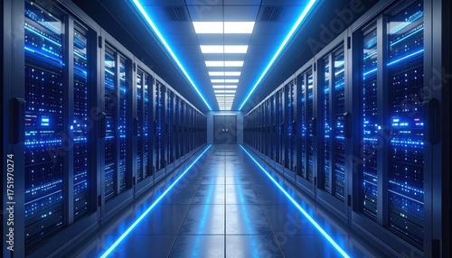 Obraz premium Futuristic Server Room with Blue Lights and Data Racks.