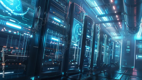Obraz premium Futuristic server room with glowing blue interfaces.