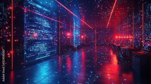 © Awan Rustiawan , Obraz premium Futuristic server room with glowing digital code on walls, red and blue neon lights, and workstations.