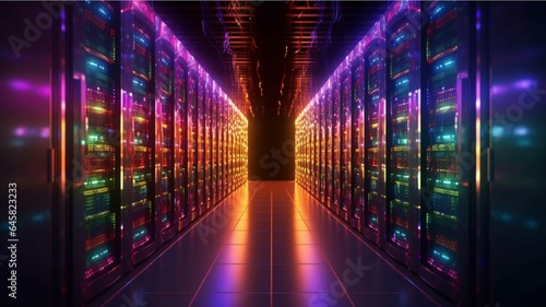 Fototapeta premium Futuristic server room with glowing lights and lightning. 3D rendering