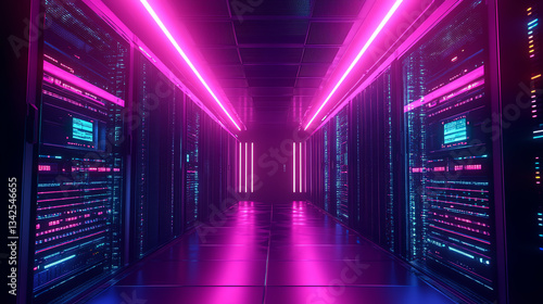 Fototapeta premium Futuristic server room with neon lighting and rows of data racks in a vibrant setting.