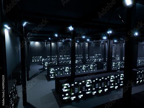 Obraz premium Futuristic server room with storage for supercomputer system and hardware,...