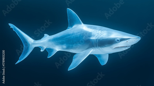 Obraz premium Futuristic shark, metallic scale, swimming, ocean, blue background, digital art, sleek