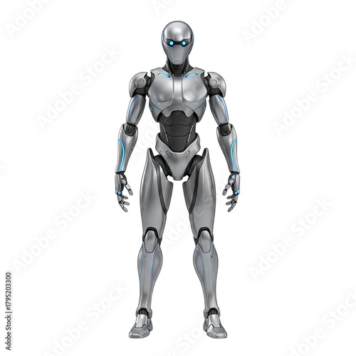Fototapeta premium Futuristic Silver Android Robot with Blue Accents Standing Against a Black Background