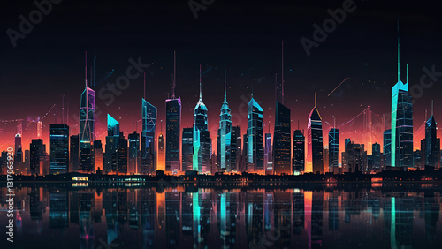 Fototapeta premium Futuristic Skyline Digital Cityscape with Glowing Connections Reflecting on Water Modern Metropolis of Innovation and Technology at Night