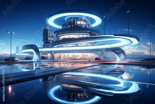 © Box Milk, Obraz premium Futuristic Skyline Mall, on an isolated Electric Blue background, Generative AI