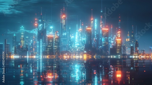 © Bussakon, Naklejka premium Futuristic Skyline of Smart City with Holographic Communication Devices