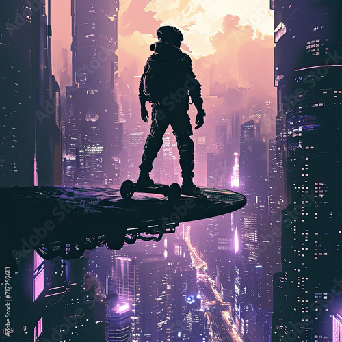 © Sekai, Fototapeta premium Futuristic Skyline Silhouette Showcasing Hoverboard Rider