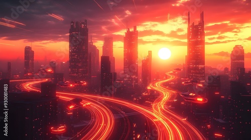 © Khukrit, Fototapeta premium Futuristic Skyline Sunset Cityscape in Vibrant Digital